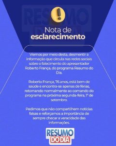 “Vimos por meio desta desmentir as informações que circulam nas redes sociais sobre o apresentador Roberto França”, diz o comunicado. “Roberto França está bem e encontra-se apenas de férias, retornando normalmente ao comando do programa na próxima segunda-feira, 1º de julho.”